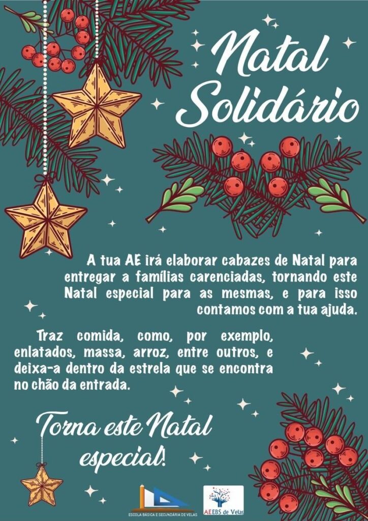 A Associação de Estudantes está a desenvolver, entre os dias 24 de novembro e 16 de dezembro, uma campanha de solidariedade de forma a, nesta época festiva do Natal, ajudar famílias carenciadas da EBS de Velas. Nesta época, apelamos à solidariedade de toda a comunidade escolar, em especial tendo em conta a situação por que todos estamos a passar.