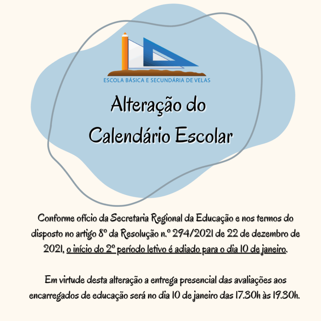 Conforme ofício da Secretaria Regional da Educação e nos termos do disposto no artigo 8º da Resolução n.º 294/2021 de 22 de dezembro de 2021, o início do 2º período letivo é adiado para o dia 10 de janeiro.
