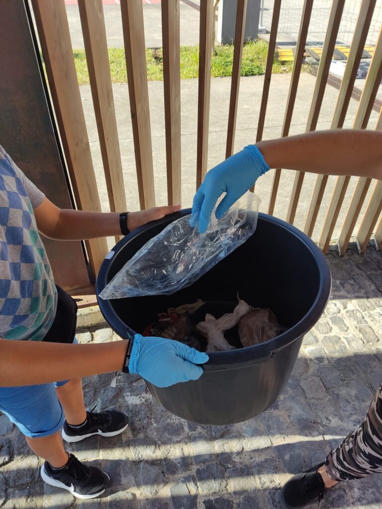 Foi sugerido que, uma vez por semana, na aula de Cidadania, cada turma procedesse à limpeza do espaço exterior da nossa escola. Munidos de baldes e luvas lá foram eles à caça dos resíduos.