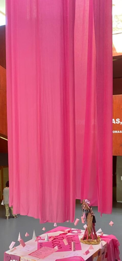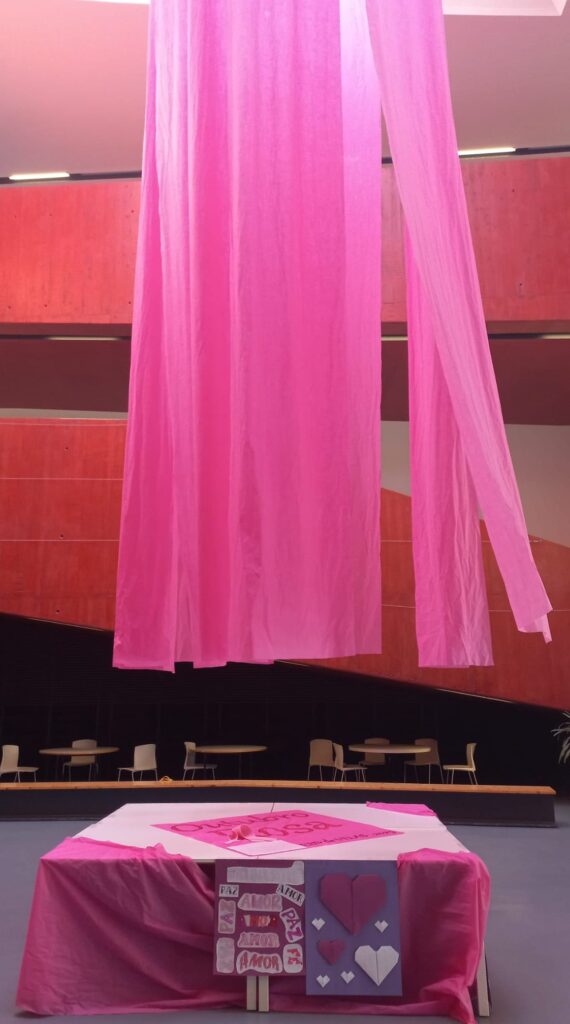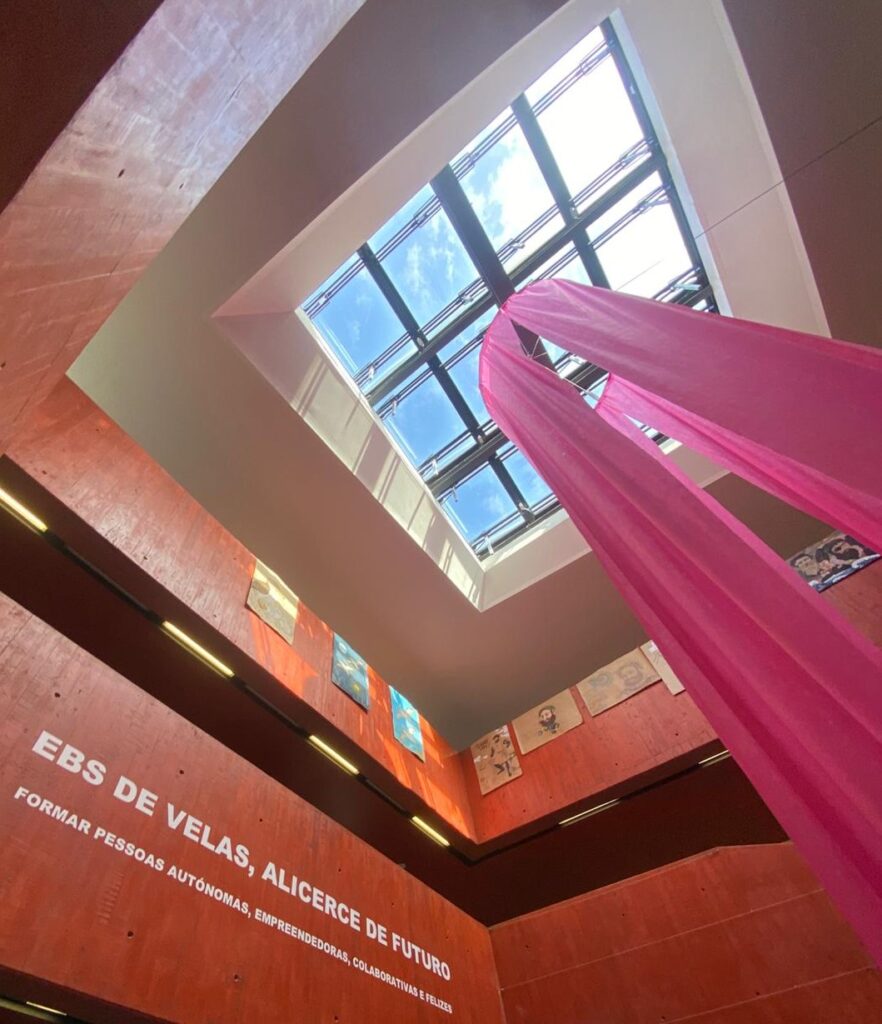 Os docentes de Artes Visuais junto com os seus alunos construíram uma instalação artística, que ficou no mês de outubro exposta no átrio principal da nossa escola. Nesse sentido, o Grupo Disciplinar de Artes Visuais propôs a colaboração da comunidade escolar nesta atividade e foram desenvolvidos nas várias áreas disciplinares, textos, frases, desenhos, colagens, construções tridimensionais, sólidos geométricos e laços rosa.